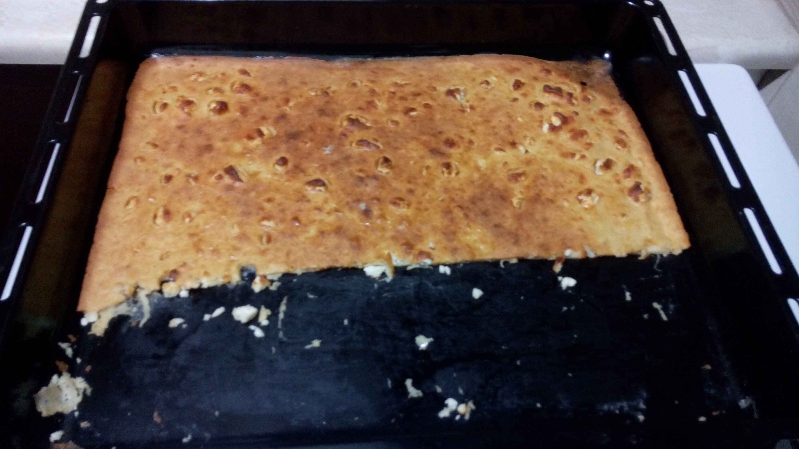 Βουτυρώνουμε το ταψί (ή το λαδώνουμε) και περιχύνουμε το μείγμα μας. Θα πρέπει να γεμίσει το ταψί μας αλλά σε ύψος πρέπει να είναι 1/2 εκατοστά. Εάν είναι παραπάνω δεν θα ξεροψηθεί και θα χρειαστεί παραπάνω ψήσιμο. Καλύτερα να βάλετε δύο ταψάκια εάν βγει το μείγμα παραπάνω. Εάν βγει λιγότερο ΜΗΝ ΑΓΧΩΝΕΣΤΕ. Στο μπολ ρίχνουμε αλεύρι, γάλα ή νερό και συμπληρώνουμε όσο χρειάζεται για να φτάσει στο επιθυμητό αποτέλεσμα.