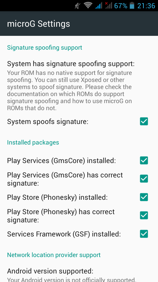 Opening microG self-checked, we are going to see that spoof signature is not passing the test.